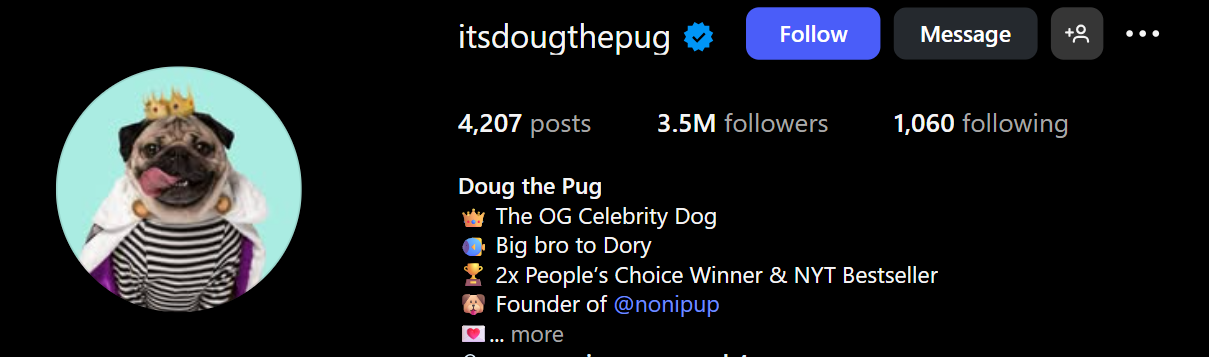 Known as the "King of Pop Culture," Doug the Pug has a brand built on his hilarious celebrity spoofs and relatable, human-like expressions. With a following of over 3.5 million on Instagram, Doug has worked with major brands like Hulu, Papa John's, and Disney. His estimated earnings can reportedly reach up to $500,000 per year from sponsored content, merchandise sales, and partnerships.