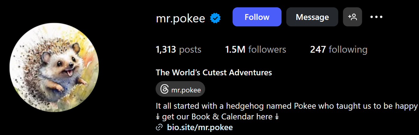 Mr. Pokee is a miniature hedgehog with a brand built on spreading positivity and joy. He is known as the world's most adventurous hedgehog, with his owner, Lisa, documenting his travels and outdoor escapades. The appeal of his content lies in the beautiful, whimsical photos and videos of him exploring different landscapes, from forests to cityscapes. Pokee's charming and cheerful personality is a constant source of happiness for his millions of followers.