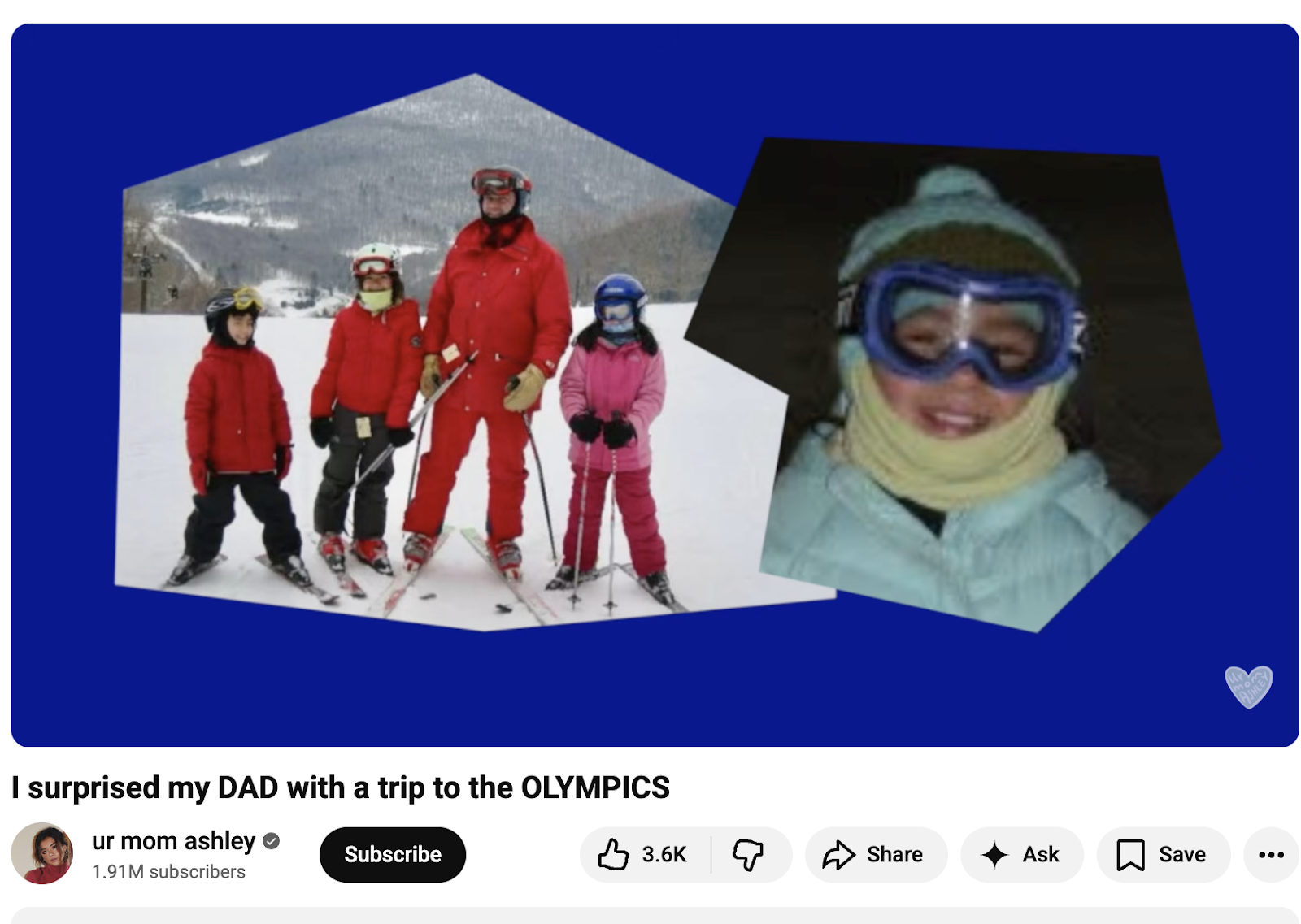 Next up, we have a new take on Olympic coverage that uses an old-school creator marketing trick. In this video, a beloved (to the tune of 1.91 million subscribers) creator surprises her ski-loving dad with a trip to the Olympics.