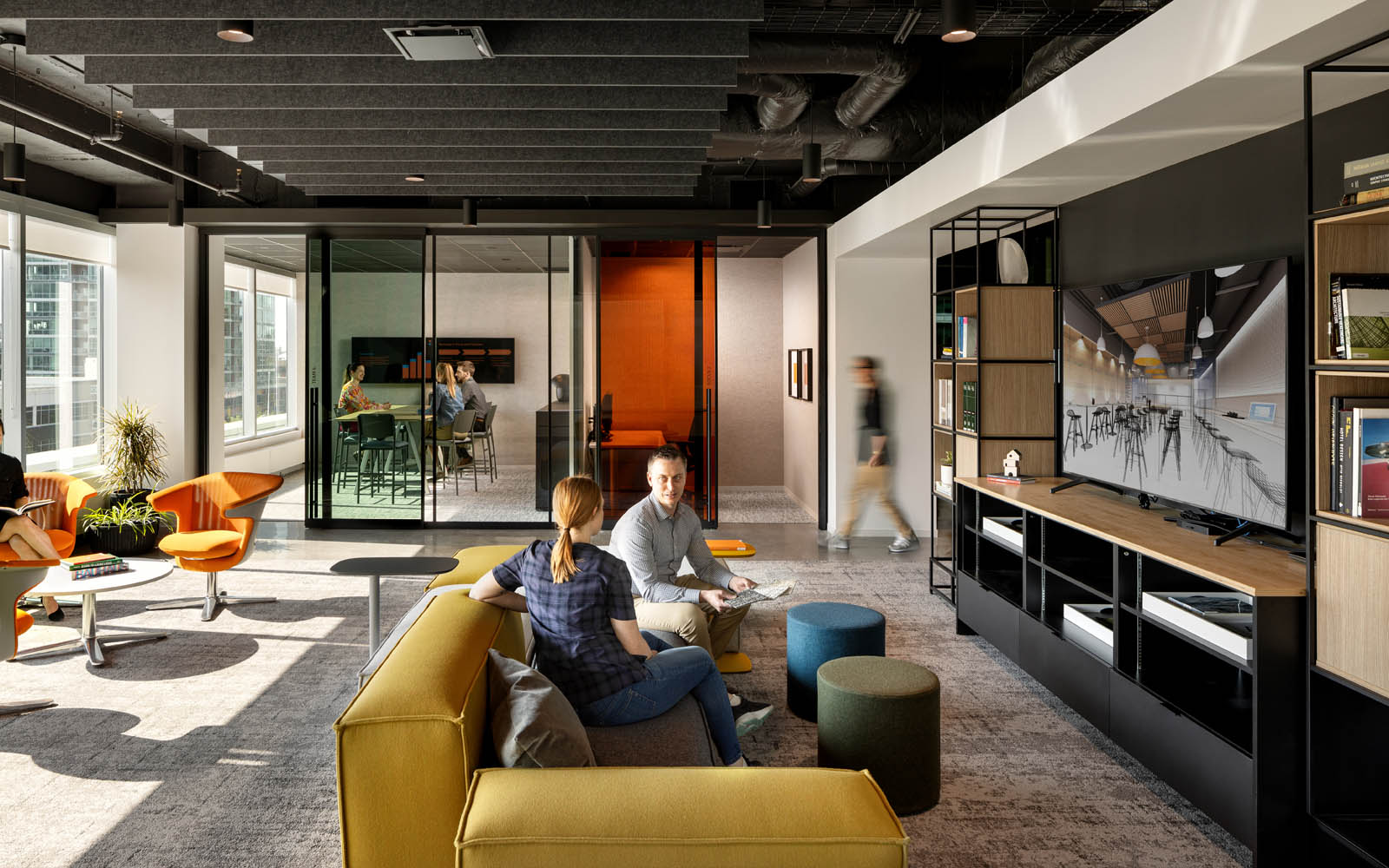 Kasian designed their new Calgary studio to integrate hybrid work models and sustainability, aiming for WELL certification, fostering movement, choice, culture, and community in a warm, welcoming environment.