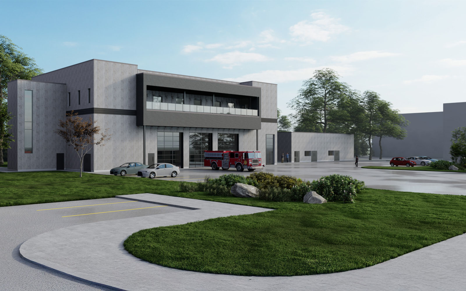 We are currently designing a new Fire Hall at Canadian Forces Ammunition Depot (CFAD) Rocky Point to replace the existing aging facility. We have completed Phase 1 of the project, developing a schematic design for the building, including the building massing, look and feel and interior planning. The new Fire Hall will include three apparatus bays and the associated support spaces on the ground level and crew quarters on the second floor. An adjacent new building will house workshops to support the maintenance of the fire engines.