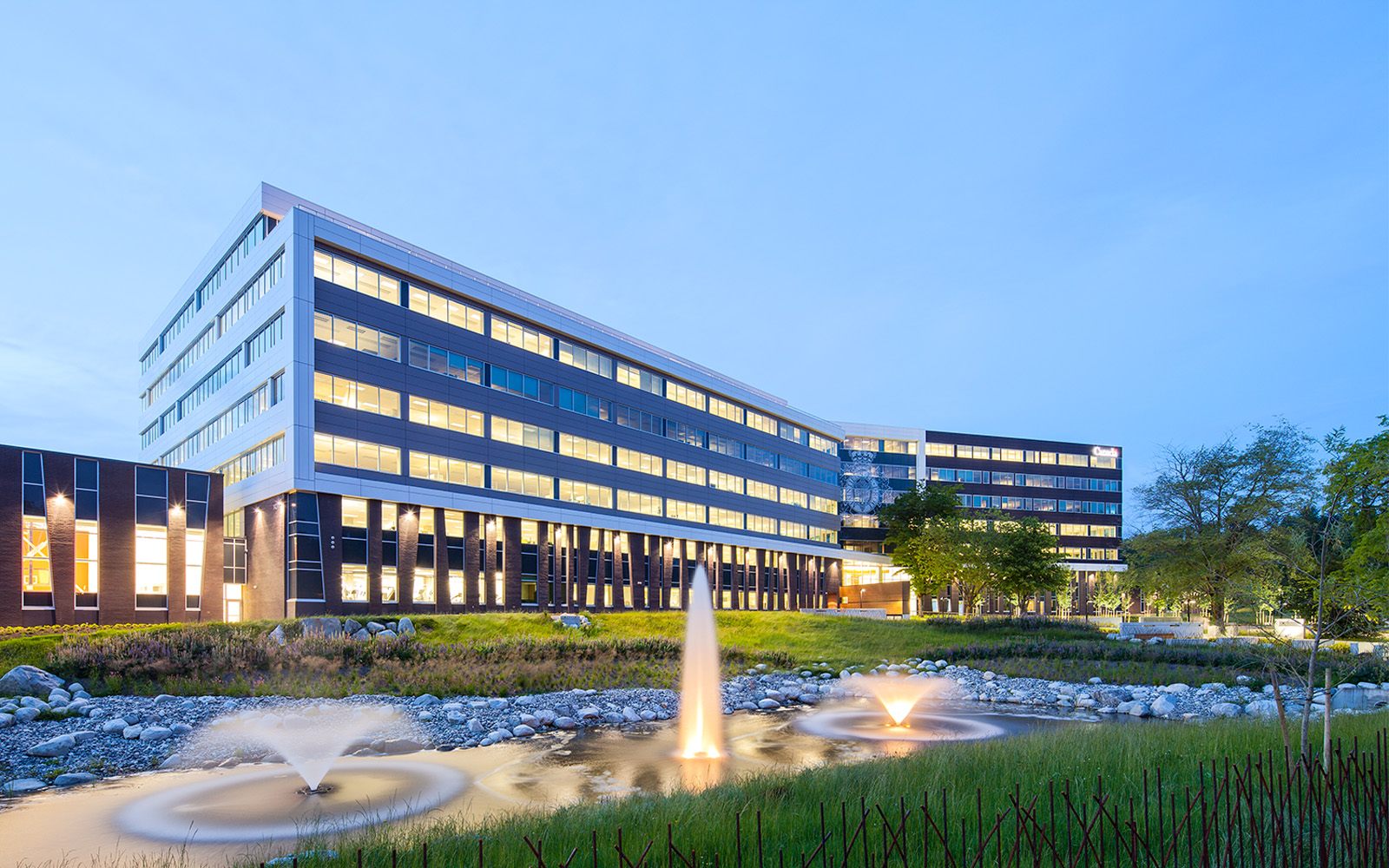 Built to LEED Gold specifications, the design takes advantage of the unique setting within the historic Green Timbers Urban Forest. Open flexible planning and extensive glazing maximizes the views promoting a healthy, vibrant work environment. The incorporation of green roofs as well as a stormwater detention pond allow the buildings to respond and contribute to the natural surroundings while addressing necessary stormwater management on site.